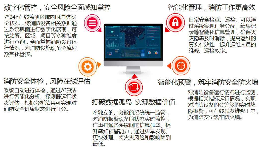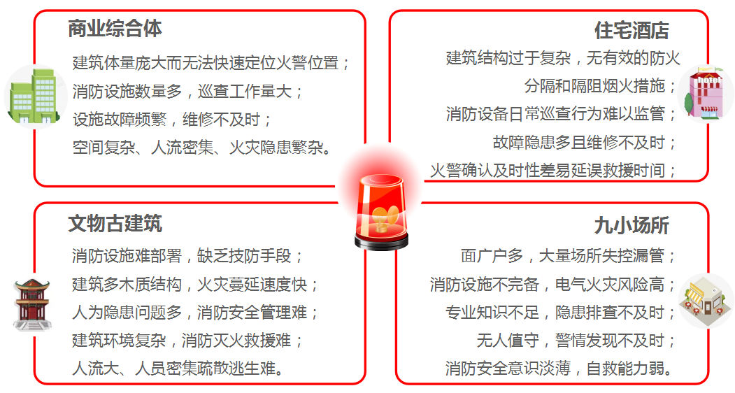 通過加裝物聯(lián)網(wǎng)探測(cè)設(shè)備,如感煙、感溫探測(cè)器,電氣火災(zāi)探測(cè)器,智能手動(dòng)報(bào)警按鈕等,對(duì)各類消防設(shè)施實(shí)現(xiàn)信息化監(jiān)測(cè)管理,系統(tǒng)7×24小時(shí)實(shí)時(shí)監(jiān)測(cè),數(shù)據(jù)動(dòng)態(tài)感知,實(shí)現(xiàn)火災(zāi)隱患早發(fā)現(xiàn)、早預(yù)警、早處置,將災(zāi)害遏止在萌芽狀態(tài)。